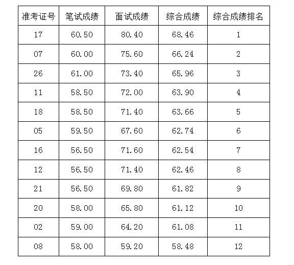 根據(jù)《大龍窩索道公司技術員招聘公告》,按筆試成績與面試成績6:4權重計算綜合成績,現(xiàn)公告如下:
