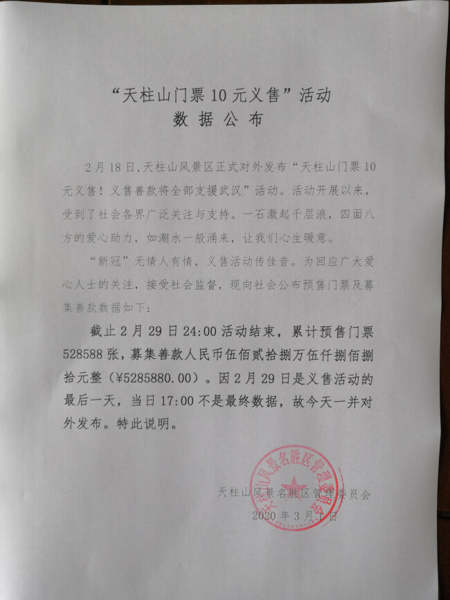 “天柱山門票10元義售”活動數(shù)據(jù)公布