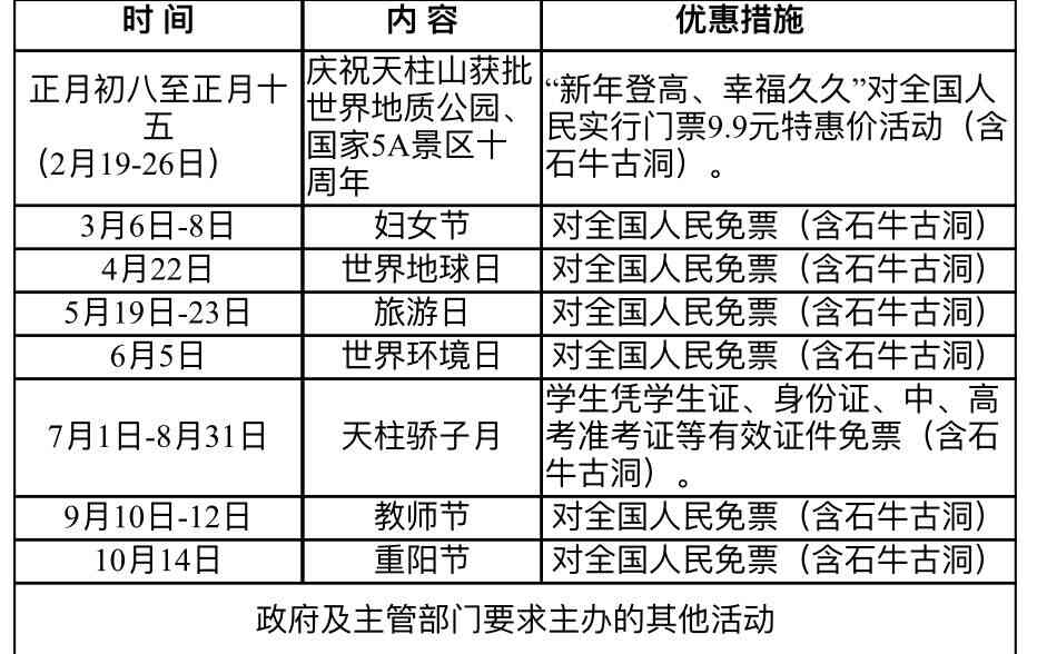 2、高鐵團(tuán)、飛機(jī)團(tuán)人數(shù)達(dá)到20人以上,憑地接社出具團(tuán)隊(duì)確認(rèn)書和高鐵票原件或機(jī)票原件,門票按全價(jià)票訂票,結(jié)算按40元/人,且包含石牛古洞。