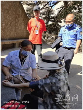 在休憩過程中,李女士低血糖犯了,倍感難受。天柱山工作人員張銳發(fā)現(xiàn)她狀況不對,上前溫馨詢問并熱情帶領她找到景區(qū)醫(yī)療人員,測量血壓,喝了一支葡萄糖。李女士的低血糖得到及時補充,休息一段時間后,精神緩和,體力恢復。在張銳的陪伴鼓勵下,李女士堅持攀登到天柱山天池峰之巔,親自拍下了雄偉神奇的天柱山主峰影像。